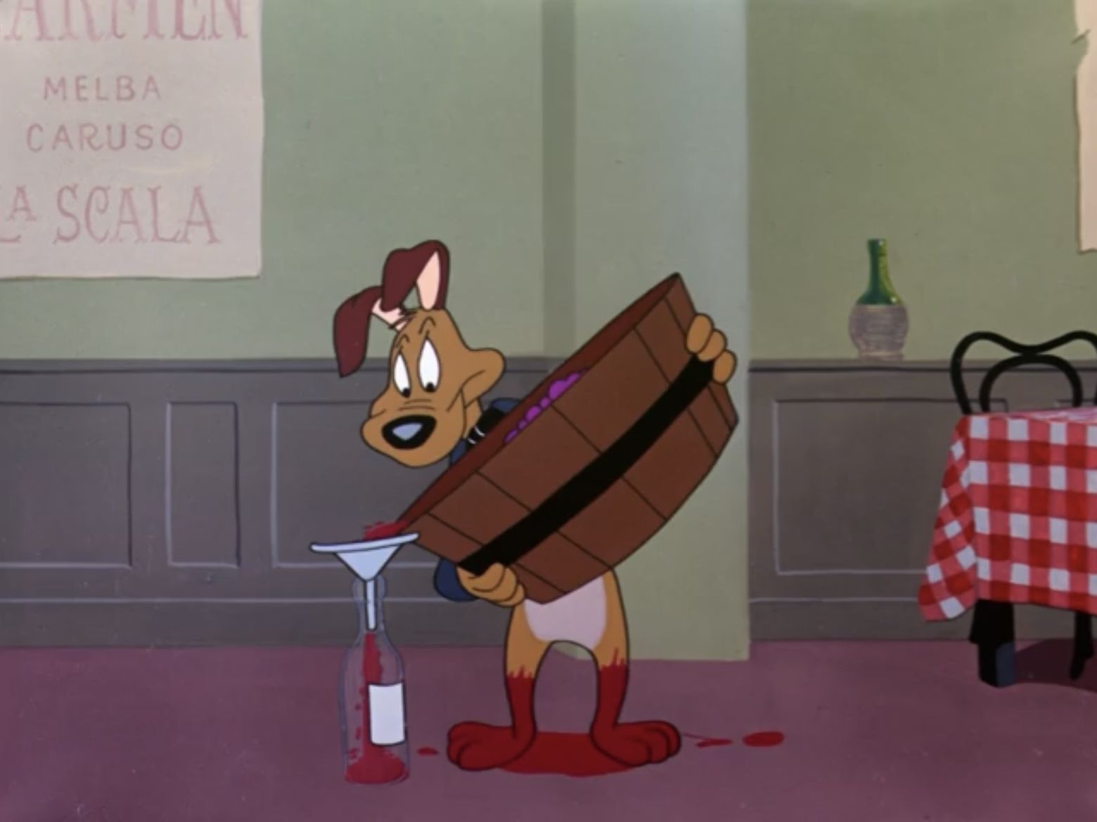 When Pasquale turns around and questions in Italian, Charlie answers, “You’re my new master!” with his eyes widening in affection and his tail wagging. Pasquale is confused, “What-a you talk? I’m-a not your new master. I’m-a not even your OLD-a master!” Charlie attempts to be specific, “Look, mac. Let’s get this straight. You’re sans dog, right?” Pasquale replies, “If you mean-a, I’m-a no gotta pooch-a, THAT’S-a RIGHT-a!” Charlie responds, “And I ain’t-a got no master! So we must solve BOTH our problems!” Frustrated, Pasquale raves in faux-Italian before Charlie is kicked out with a pot of pasta on his head (animated by Washam).