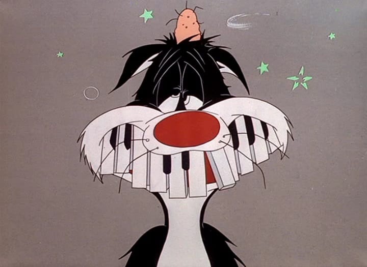 Sylvester hoists a piano up with a rope and pulley (animated by Carey) and puts the can under said piano. The mouse tricks him into letting go by offering the can opener to him, which causes Sylvester to let go of the rope. Once he does, the mouse runs away silently laughing while Sylvester gives an “Oh, no” before the piano crashes atop him, sending him through the floor into the basement. In a daze, he is also seen with some of the piano keys as teeth (animated by Ross).
