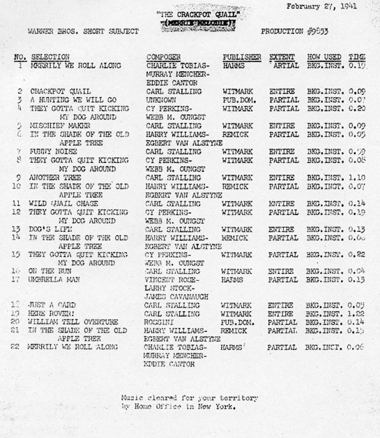 This is one of the few cartoons where the cue sheet (the sheet that reveals what songs are heard in the cartoon) is publicly available.