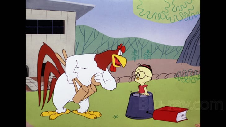 Prissy walks out of her henhouse with Jr. and has him sit down on a bucket in the yard to read. “Sit right down here, Jr. Now I want Mother’s Little Man to sit quietly and study while Mother’s at the hen party. Understand?” Foghorn, who’s leaning against a barrel and twirling a yo-yo, greets her as she passes by, “Good, I say, good morning, Widow Hen!” Prissy only gives him a cold shoulder, “Hmmph! Loafer!” Foghorn responds to this with, “That woman’s as cold as a nudist on an iceberg” before looking at Jr. and deciding, “‘Mother, I say, Mother’s Little Man’. Huh! She’s trying to make a pantywaist out of that poor kid! I think, I say, I think I’ll just mosey over there and help that little bookworm turn! (laughs) Worm turn! (laughs)” (animated by Charles McKimson).