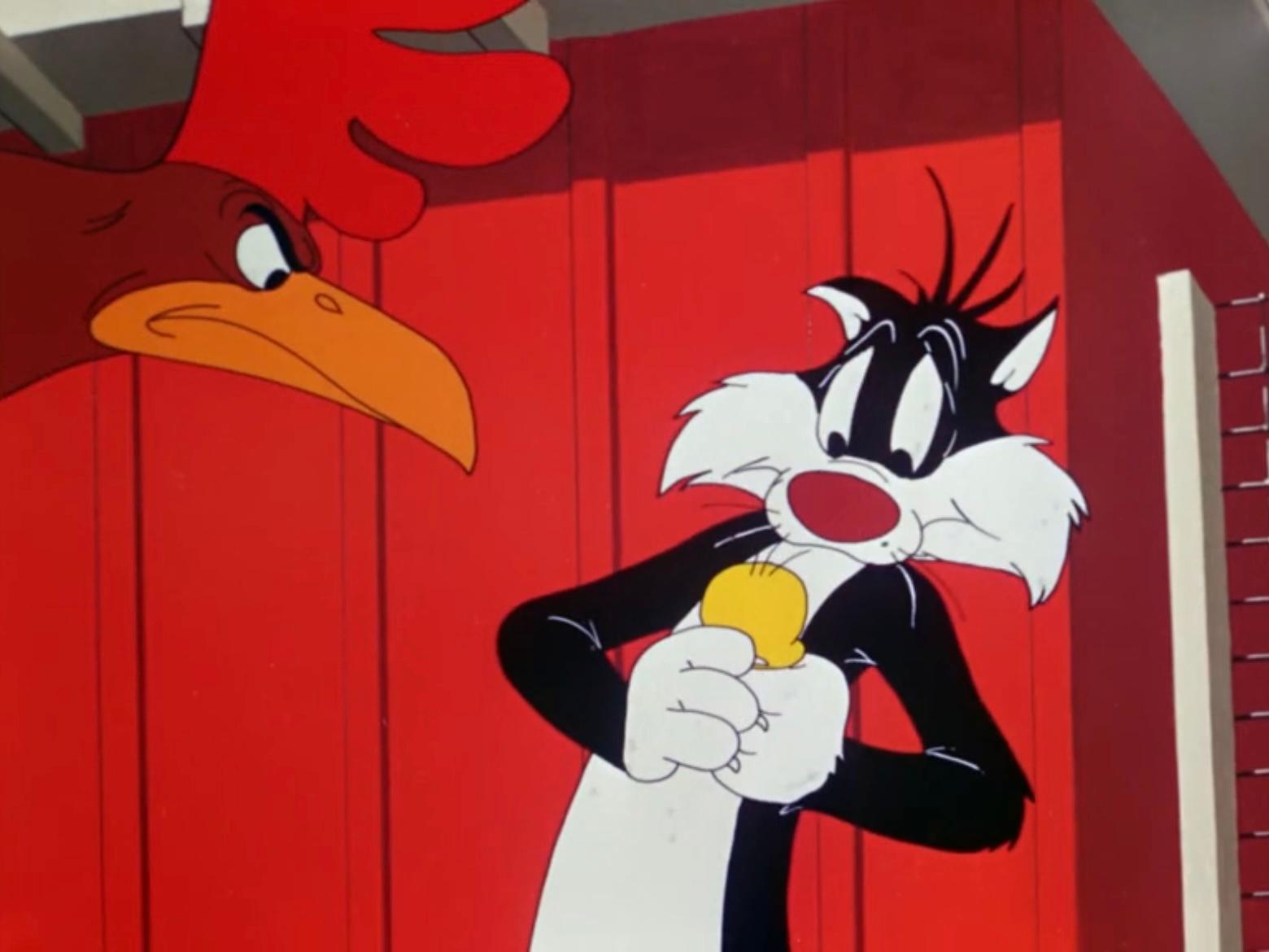 Upon seeing the hen following him, Sylvester bumps into the rooster while running away. The rooster interprets the hen’s squawking as Sylvester stealing one of her “chicks”. Looking at the rooster giving him an angry stare, Sylvester puts on a friendly facade and pats Tweety on the head before sheepishly giving him back to the hen. Tweety confides, “You see, he’s weawwy a nice putty tat” before groaning “Eee!” in disgust. After the hen walks away contently with Tweety, the rooster deals with Sylvester by taking out a foldable wardrobe and beating him up from behind it, so the audience doesn’t see Sylvester getting beaten up. Sylvester shortly staggers out from behind the wardrobe with a lump on his head, and a few bits of fur missing (animated by Champin).