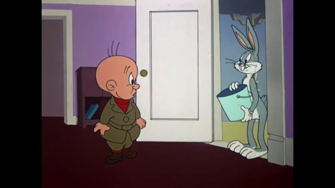 Elmer is walking with a hoe while singing, “In a Little Red Barn On a Farm Down in Indiana” when he is soon joined by Bugs. Elmer stops singing upon realizing this, leaving Bugs to sing solo before he ducks back down into his hole upon noticing Elmer. Realizing Bugs has been stealing his carrots again, Elmer rages, “Oooooooh! That wascal wabbit is in my cawwots again!”, before going back into his house to change into his hunting clothes and get his rifle (animated by Virgil Ross).