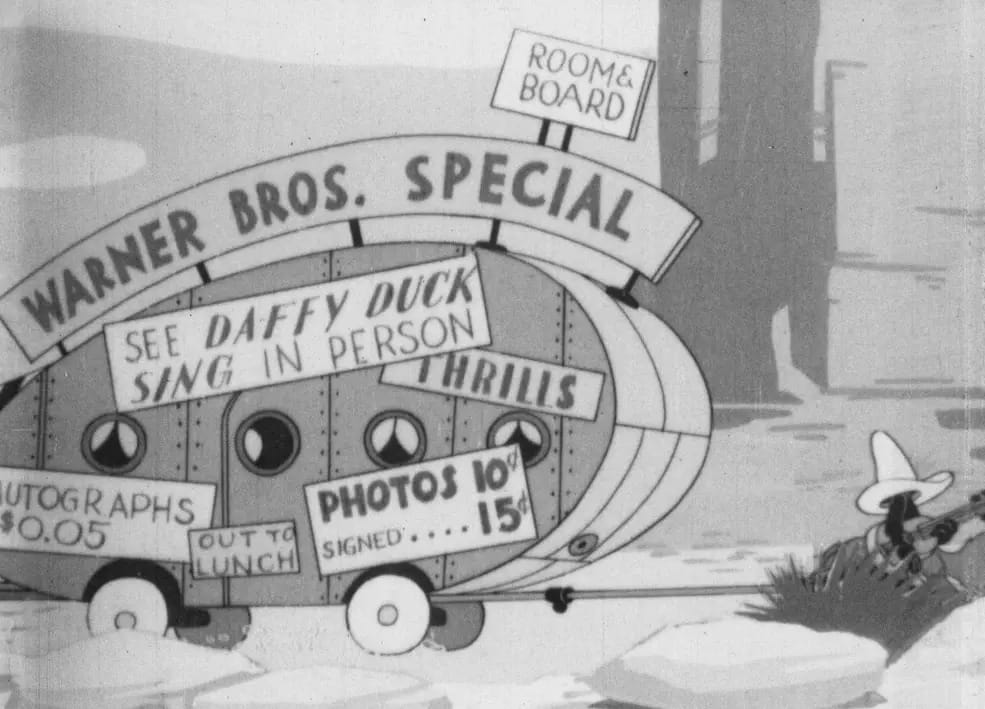 I was expecting to post this on March 28 (the Saturday after the release of Looney Tunes Collector’s Vault Volume 2 on March 24), but it turns out I get to post this earlier than expected. One of the four cartoons specifically restored by Warner Archive for this new set, “The Daffy Duckaroo” (I did a post on this one back in December 2024) had, for many years, been missing the above scene where Daffy’s trailer is revealed with various signs on it. The banner above it reads, “Warner Bros. Special”. When the black and white Warner cartoons were sold to Sunset Productions for television airings in the 1950’s and 1960’s (barring the Merrie Melodies from the Harman-Ising era- except for “Lady Play Your Mandolin”- which were sold to Associated Artists Productions along with all of the color Warner cartoons released before August 1948), the opening and closing titles were replaced as were any gags referring to Warner Bros. because studio head Jack Warner was dismissive of the idea of television and didn’t want to get involved with it in any way. Fortunately, these opening and closing titles and gags are still intact in the original negatives (since black and white was being retired in favor of color around the time certain cartoons were being reissued, the black and white cartoons were excluded from getting Blue Ribbon reissues and therefore having their opening credits removed) so come March 24, this once-lost scene will no longer be lost.